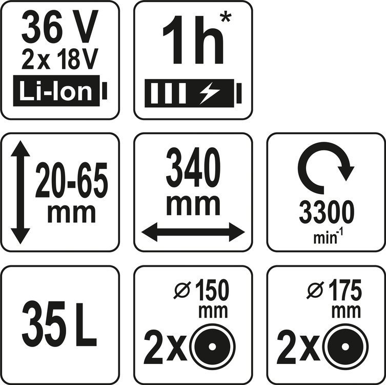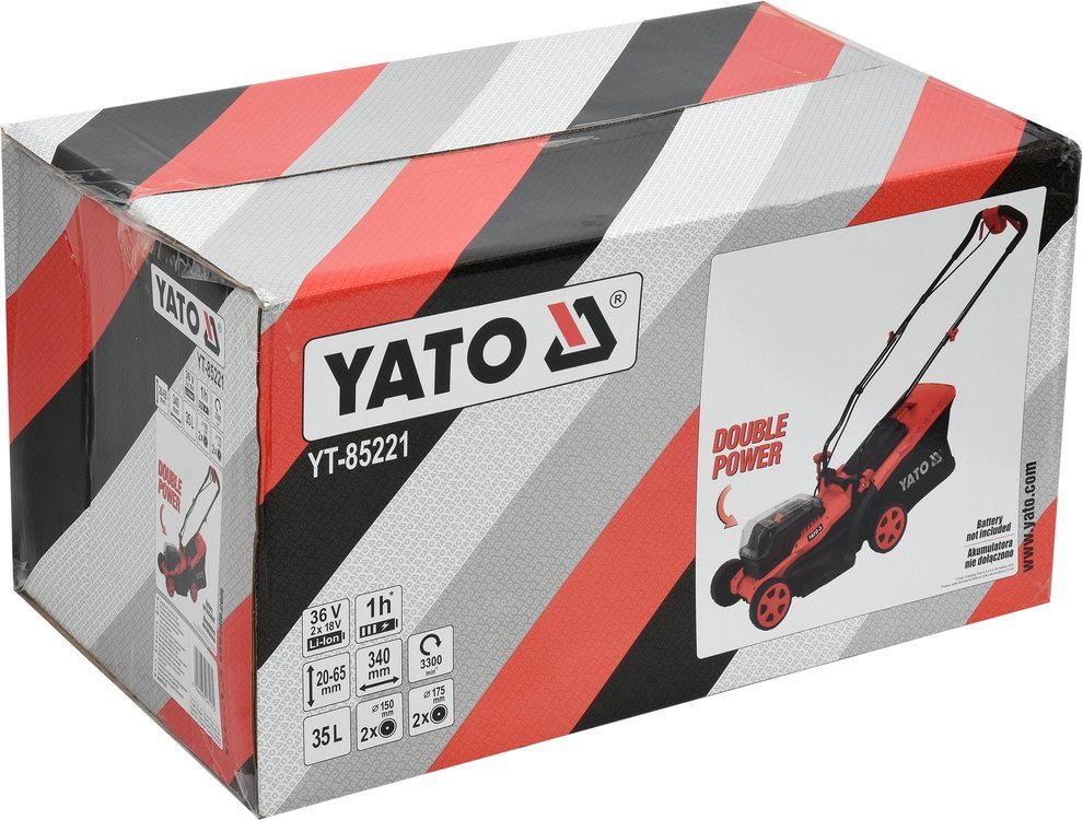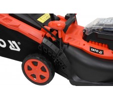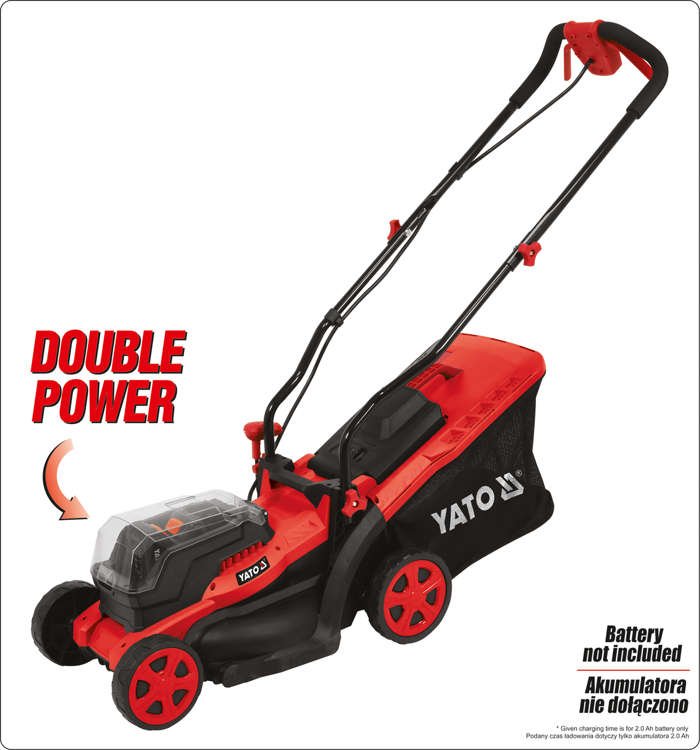 Matching batteries available: 2 Ah (YT-82842), 3 Ah (YT-82843) and 4 Ah (YT-82844); 6 Ah YT-82845 battery is not compatible with the mower