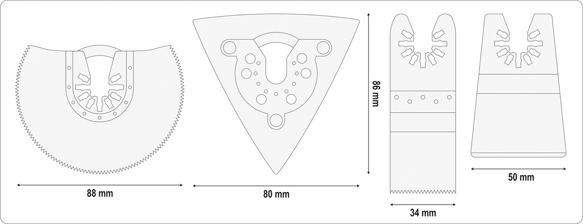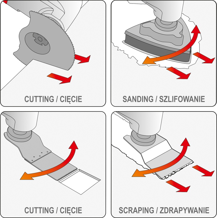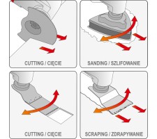 Recommended during repairs, renovations and renovation works. It allows cutting furniture boards, undercutting doors and cutting panels and baseboards without damaging the laminate, as well as metal elements (nails, screws). It is used for cutting, plunge cutting without drilling, grinding in hard-to-reach places, and removing plasters, screeds, adhesives and paint coatings.