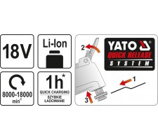 The 18 V system is a series of YATO cordless tools that are powered by the same durable battery. Each of the devices can be purchased as a set with a battery and a quick charger, or also solo, which is ideal when you increase your tool kit.