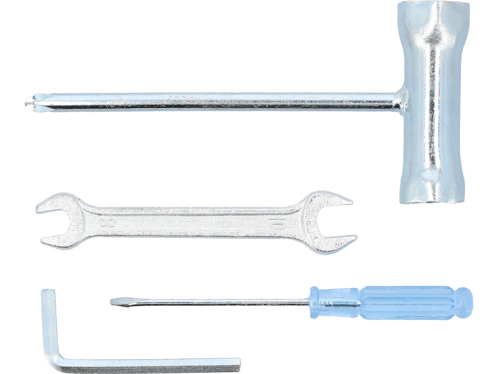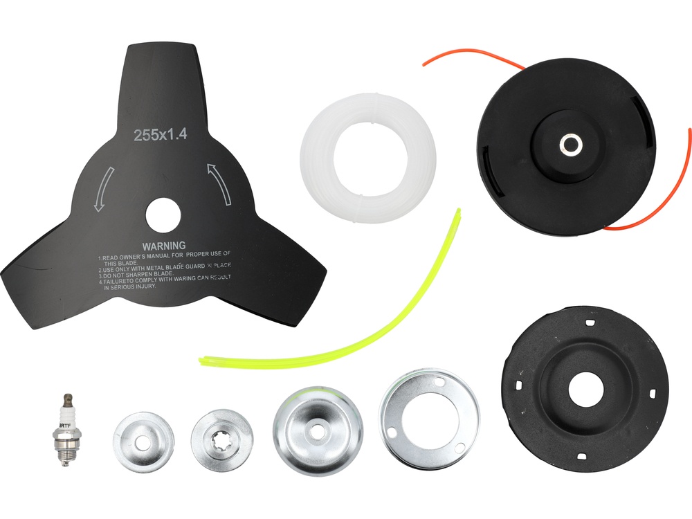 scythe, nylon trimmer head x2, metal trimmer head, three-tooth blade, trimmer line, spark plug x2, fuel tank, guard blade, tool kit, double harness