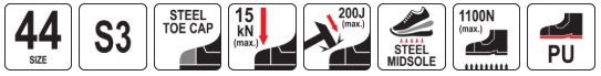 steel toe cap resistant to impact with energy up to 200 J and compression up to 15 kN