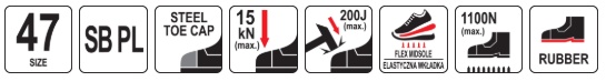 Protection against sole penetration is guaranteed by a flexible protective insole made from the material used in the production of bulletproof vests, with a thickness of up to 4 mm. The toes are protected by a strong impact-resistant steel toe cap.