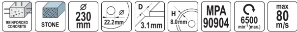 Universal diamond shield for angle grinders. Equipped with a 8 mm high turbo segment. Designed for "wet or dry" work. Recommended for cutting hardened concrete, reinforced concrete, brick, granite, wall, stone, sandstone. Recommended turnover around 6500 rpm