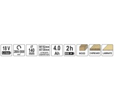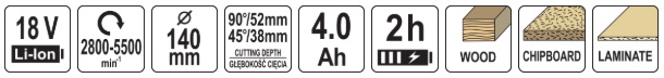 Diskinis pjūklas giluminis akumuliatorinis | 140 mm | 52 (90˚) 38 (45˚) mm | 18V | 4 AH (YT-821701)