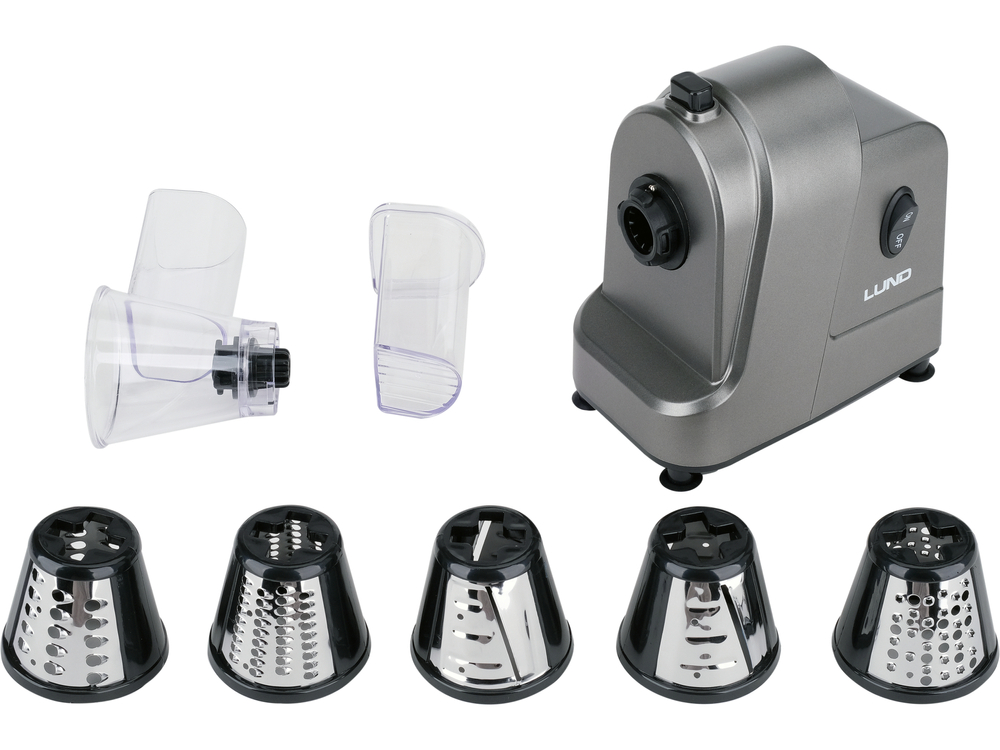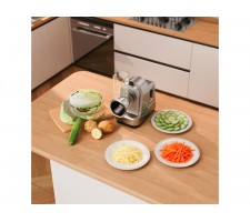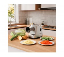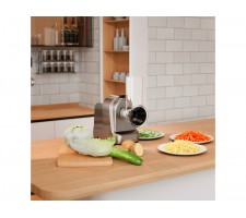 An electric slicer with a power of 250 W is a practical device that significantly facilitates daily meal preparation. It quickly and evenly slices vegetables into slices or shavings, helping in the creation of fresh salads, coleslaws, and side dishes for dinner. Five interchangeable drums with stainless steel blades ensure precise cutting of raw and cooked vegetables of various thicknesses.