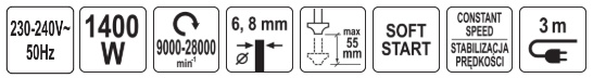 electronic regulation of rotational speed: 9000-28000 min⁻¹