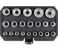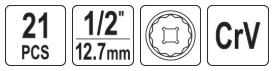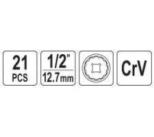 includes 21 twelve-point sockets 1/2" in sizes: 8, 9, 10, 11, 12, 13, 14, 15, 16, 17, 18, 19, 20, 21, 22, 24, 27, 30, 32, 34, 36 mm