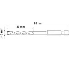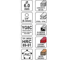 Universal drill bit YATO YT-44783. Universal drill, which thanks to the special design of the spiral enables drilling in almost all materials - metal, concrete, aluminum, ceramics, wood and plastics. • YG6X tungsten carbide blade with a hardness of 89–91 HRC • Drill body with a hardness of 42–45 HRC • Spiral geometry accelerates the removal of debris • Efficient, durable and resistant to damage and blunting • HEX 1 / 4ʺ (6.3 mm) hexagonal handle enables fastening for cordless screwdrivers and impact wrenches.