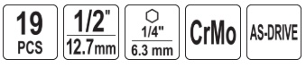 16 hex sockets 1/2" in sizes: 8, 10, 11, 12, 13, 14, 15, 16, 17, 18, 19, 20, 21, 22, 23, 24 mm