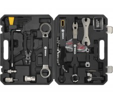 A practical set of tools for independent bicycle repair. It contains a complete set of necessary keys and accessories enabling simple adjustments and more serious service work. Facilitates quick replacement of components and mechanisms in a safe manner, especially in emergency situations. It is useful in a home workshop and during travel.