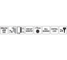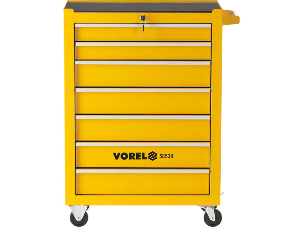 A sturdy service cabinet with 7 drawers makes it easy to organize and quickly access tools. Thanks to its durable construction with an anti-slip and chemical-resistant worktop and drawer lock, it is a reliable solution both in professional service centers and home workshops.