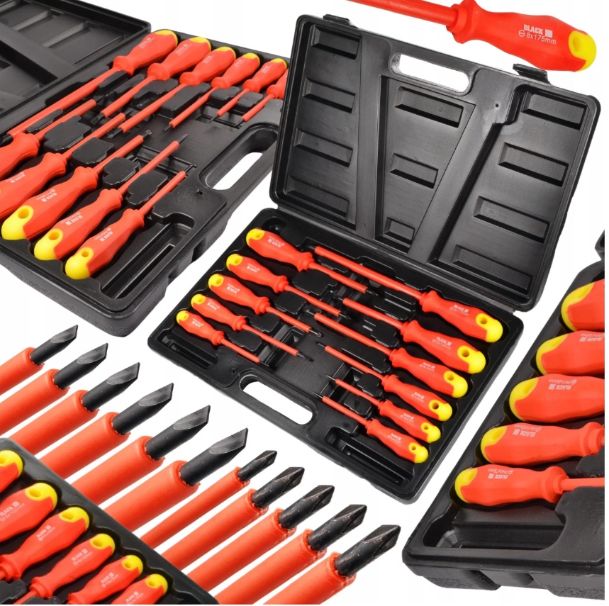 The insulated screwdrivers included in this set, designed for working under voltage, are made of high-quality chrome-vanadium steel.