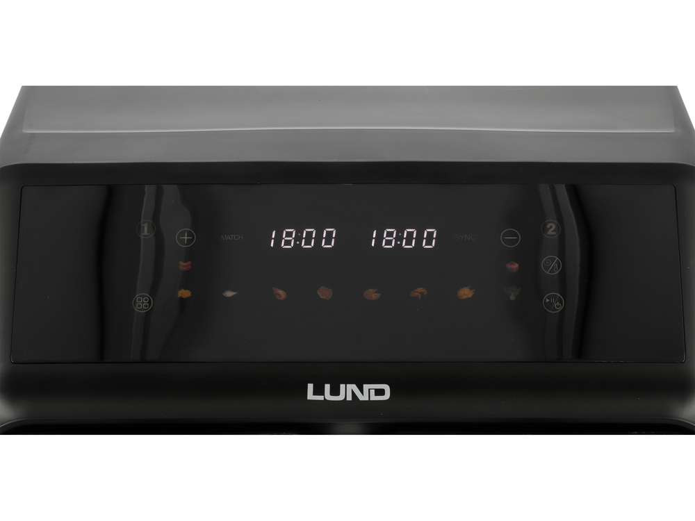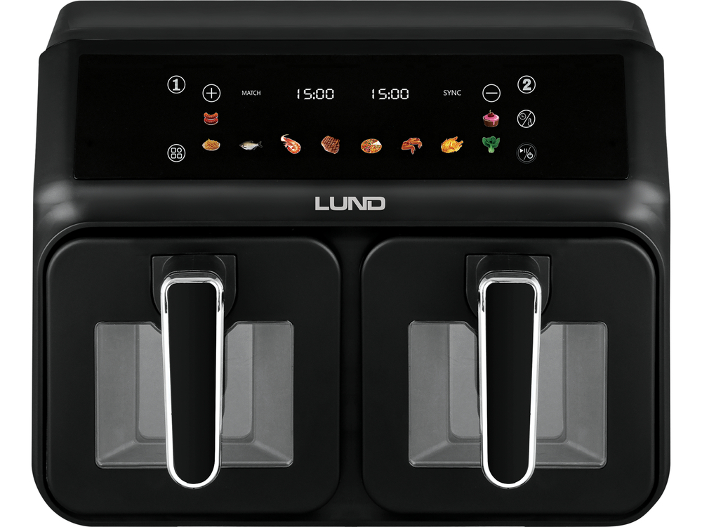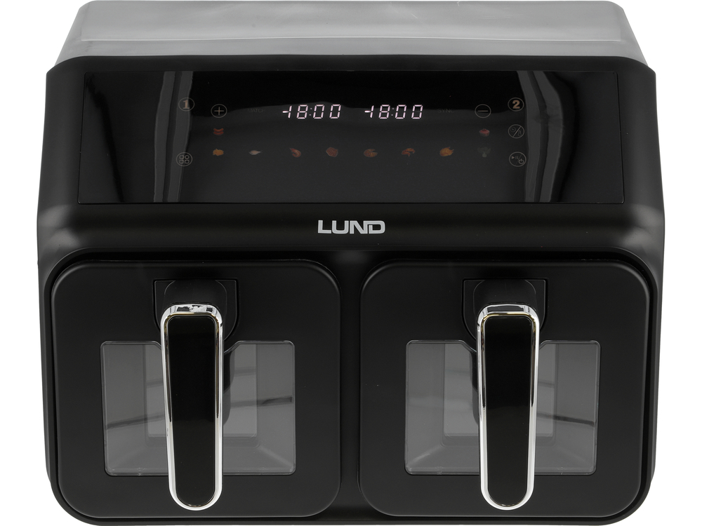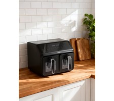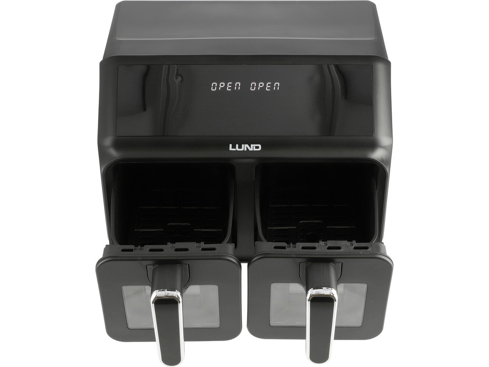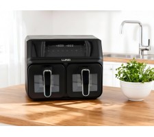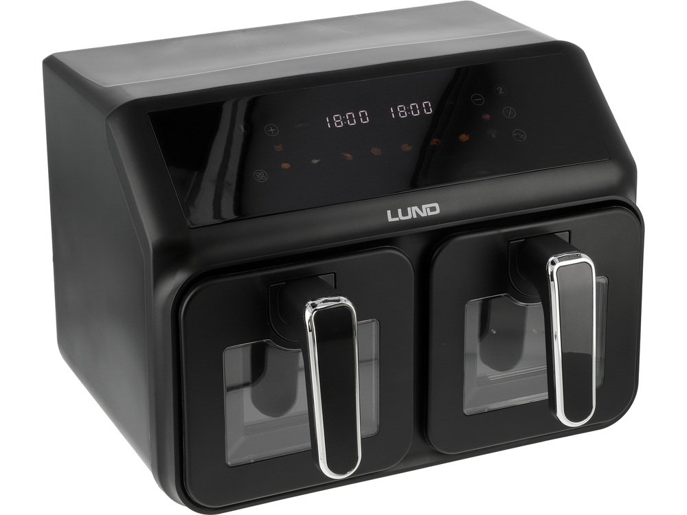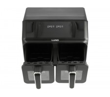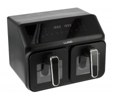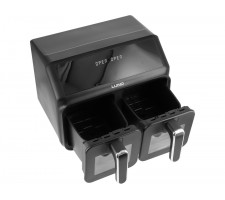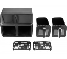 A multifunctional, oil-free fryer with two separate bowls is a practical device that will replace several kitchen appliances, allowing you to prepare healthy and quick meals for the whole family and guests. It has a non-stick coating, thanks to which a little fat or its complete elimination is enough to prepare tasty and aromatic dishes. It allows for defrosting, reheating, baking, frying, and grilling vegetables, meats, fish, as well as sweet and savory pastries.