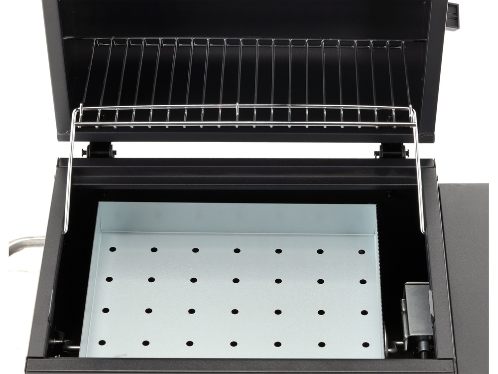 Functional grilling surface - a steel, enameled grate measuring 39.5 × 29.5 cm and 3 mm thick ensures even heating and stable temperature maintenance during grilling. An additional warming rack with a surface area of 38 × 20 cm allows for placing ready dishes or gently keeping them warm without direct contact with the heat.