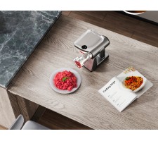 The durable ABS housing and metal tray ensure the stability and long life of the device, while the stainless steel blade guarantees precise and uniform grinding. The set includes three screens with a diameter of 4 mm, 7 mm, and a pusher, allowing you to adjust the degree of grinding to the type of dish. Additionally, three sausage filling nozzles and three kebbe attachments allow you to create a variety of homemade dishes.