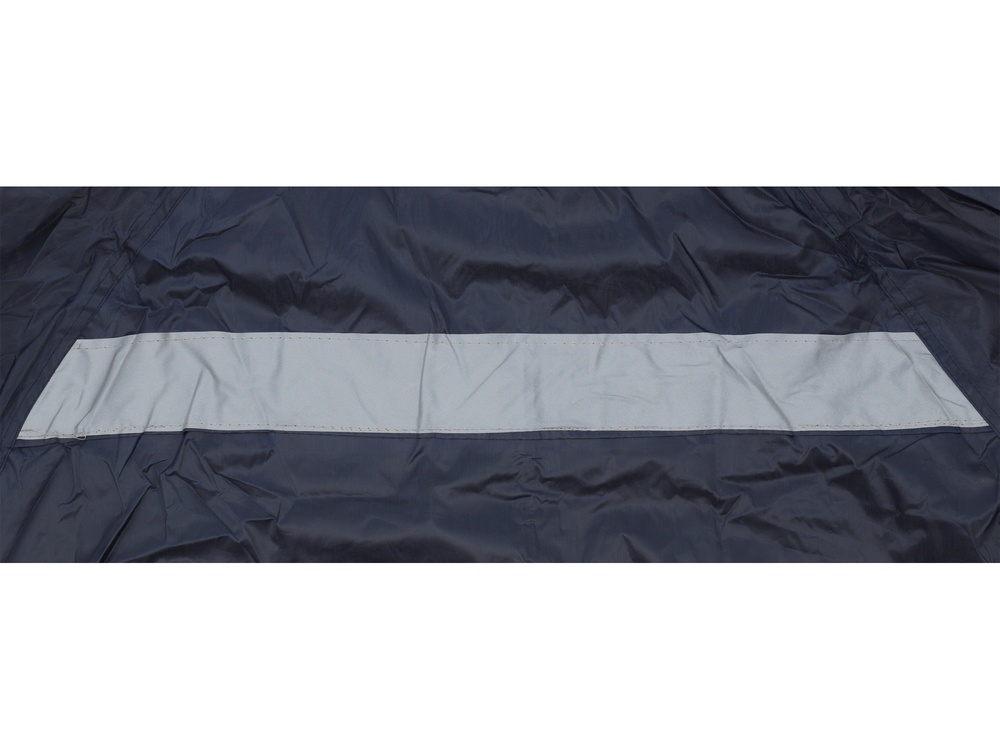 Light raincoat with visibility-enhancing reflective stripes, two large pockets, and an adjustable hood.