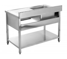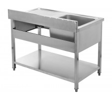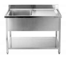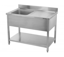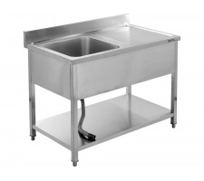 This catering table with a shelf and single-bowl sink is a practical workstation designed for professional kitchens, catering facilities, and food service establishments. It combines the functions of a worktop and a wash area in a single structure, streamlining workflow and enabling optimal use of available space.