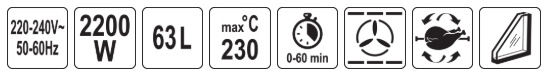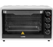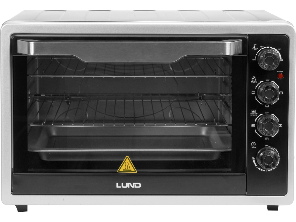 Powerful and capacious multifunction oven with rotating spit and thermo-circulation. Intuitive control panel with 4 knobs allows you to adjust the temperature, heating time and thermo-circulation to the food you are cooking. INFORMATION:power: 2200Winter capacity: 63 litersTemperature control up to 230 degrees CelsiusTimer: 60 minutes with beeperConvection heating - thermo-circulation4 heights (levels) to choose fromintuitive control panel with 4 knobs allows multiple configurations-temperature, time, thermo-circulation and rotisserie, heating mode.ACCESSORIES:tray2 x gratescrotch (rotatable 360 degrees)handle for tray and gratescrotch handle for rotisserieCrumb trayBUILDING AND DIMENSIONS:4 stainless steel heaters (2 upper and 2 lower)galvanized surface coating inside the ovenUndercoated glass doorLamp illuminating the interior of the ovenConvenient, non-warming handleRed indicator lightExterior dimensions: 61 x 45 x 41 (width x depth x height)Internal dimensions: 46 x 38 x 32 (width x depth x height) Knob no. 1 - temperature selection in the range of 100-230 degrees CelsiusDial no. 2 - selection of oven mode - bottom-heat toasting, top-heat toasting, top and bottom-heat toastingDial no. 3 - thermo, 360-degree rotisserie, thermo + 360-degree rotisserieRotary knob no. 4 - timer from 0 to 60 minutes Thermo - hot air set in motion. Thanks to it, the temperature is the same in every part of the oven. This makes it possible to heat food evenly as well as cook it on several levels at the same time.
