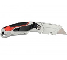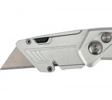 Trapesoidal blade knife designed for intensive assembly and warehouse work, where a strong and stable blade is required. The aluminum body supplemented with ABS and TPR elements increases resistance to damage, while improving grip when cutting harder materials. The SK5 tool steel blade ensures high durability and repeatable cutting quality.