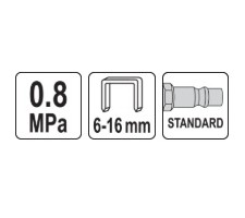 The pneumatic power supply with a maximum operating pressure of 0.8 MPa ensures constant driving force and high efficiency. The standard air connection and compatibility with a 3/8" (9.5 mm) hose make the tool easily compatible with most compressors available on the market.