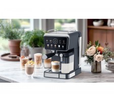 The colorful touch panel makes drink selection and device operation quick and intuitive, while the Thermoblock system and 20 bar pump ensure stable extraction and readiness to work in just 45 seconds. The removable milk frother with foam density adjustment, heated cup tray, and precise temperature control make every drink taste like in a professional café. The automatic cleaning program and spacious, easy-to-clean water and milk tanks simplify daily operation.