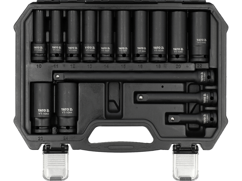 12 hex sockets 1/2" in sizes: 10, 11, 12, 13, 14, 15, 16, 18, 20, 22, 23, 24 mm