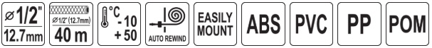garden hose 1/2" (12.7 mm), 25 m, 1/2" (12.7 mm) guide hose, 2 m, automatic retractor, fixing anchors x4, 1/2" (12.7 mm) quick-release coupling, 1/2" (12.7 mm) quick-release coupling x2,