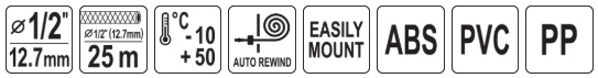 garden hose 1/2" (12.7 mm), 25 m, 1/2" (12.7 mm) guide hose, 2 m, hose trolley, 1/2" (12.7 mm) quick connector x2, 1/2" (12.7 mm) quick-release coupling stop,