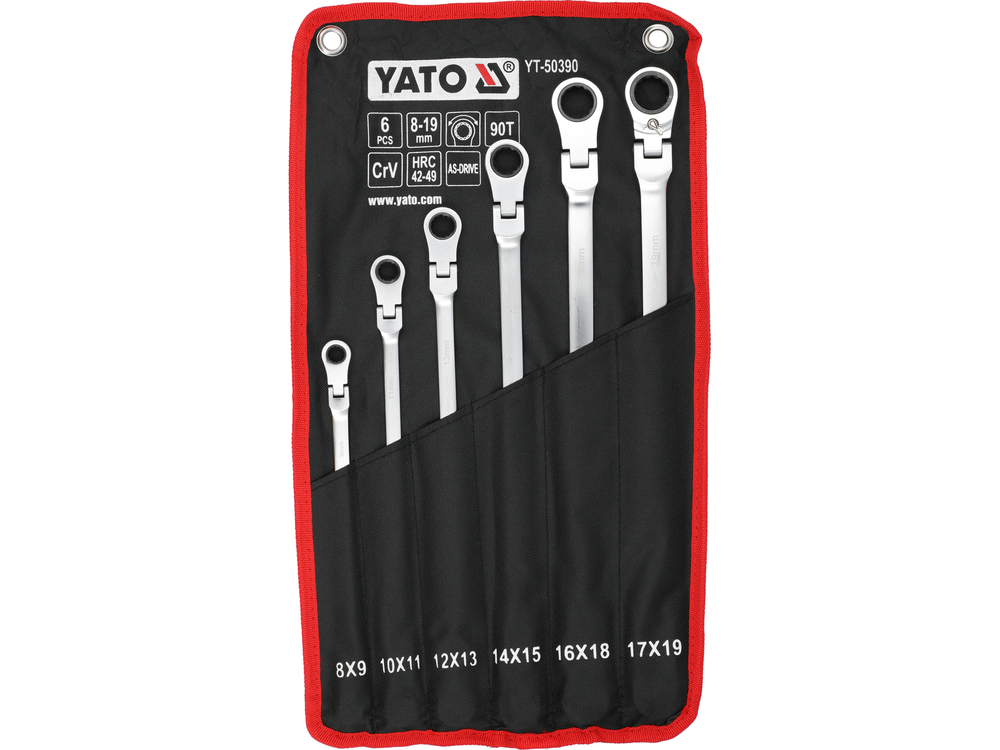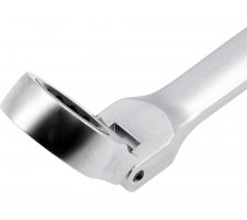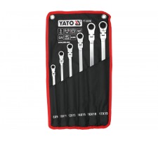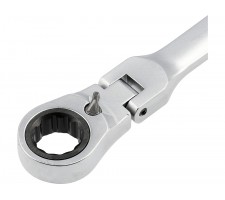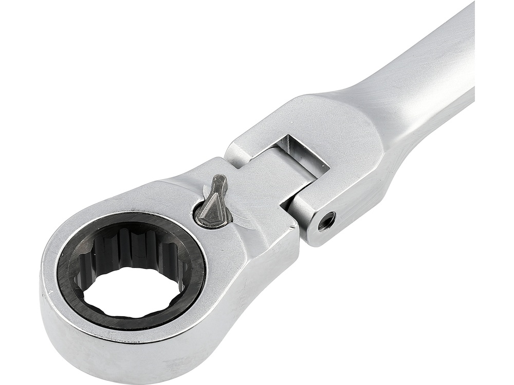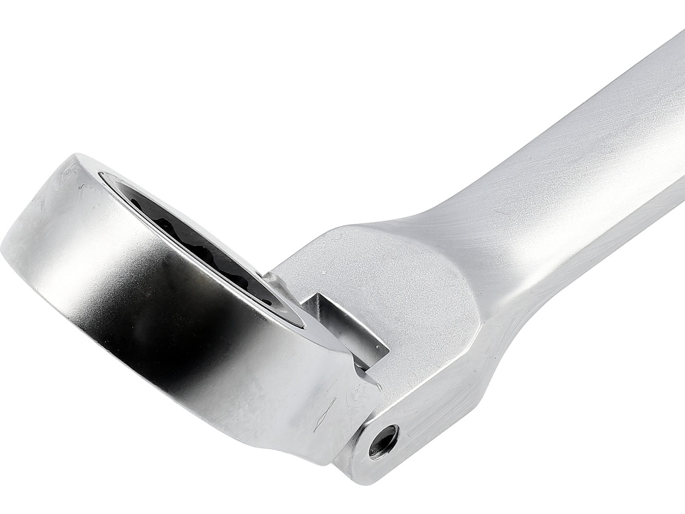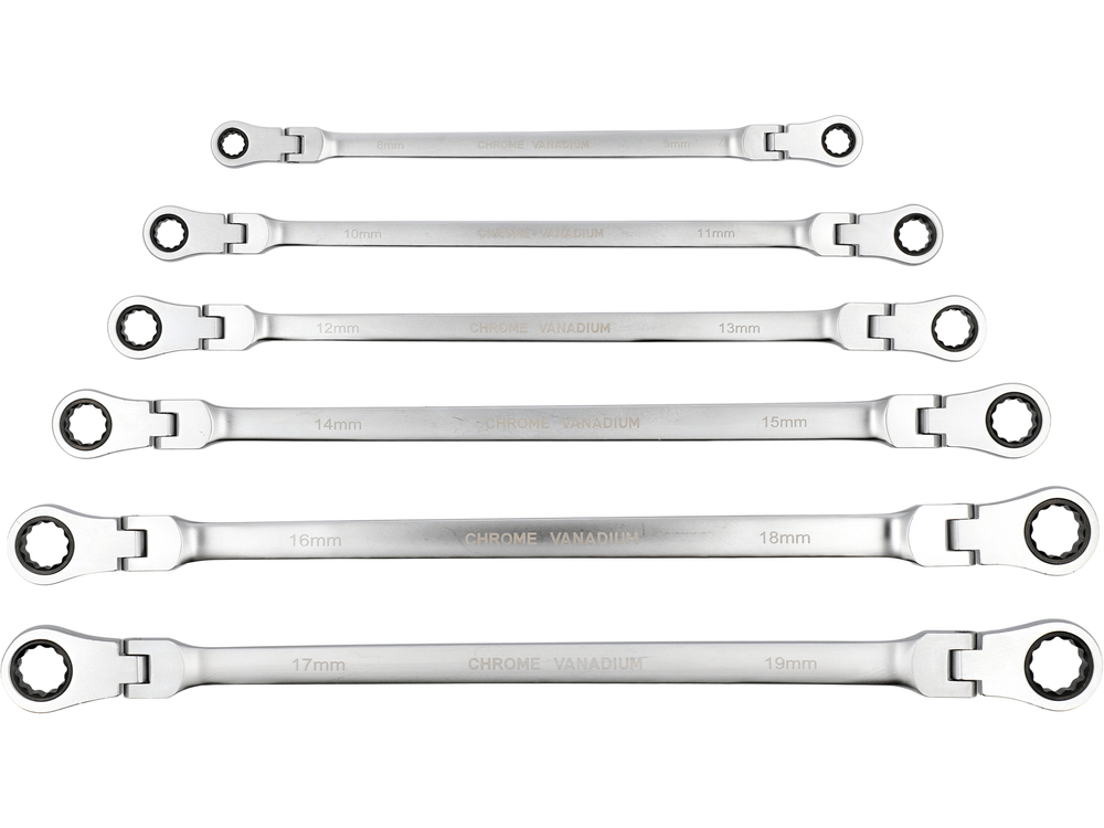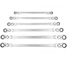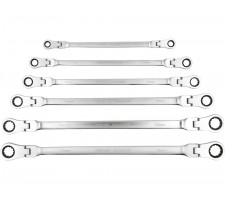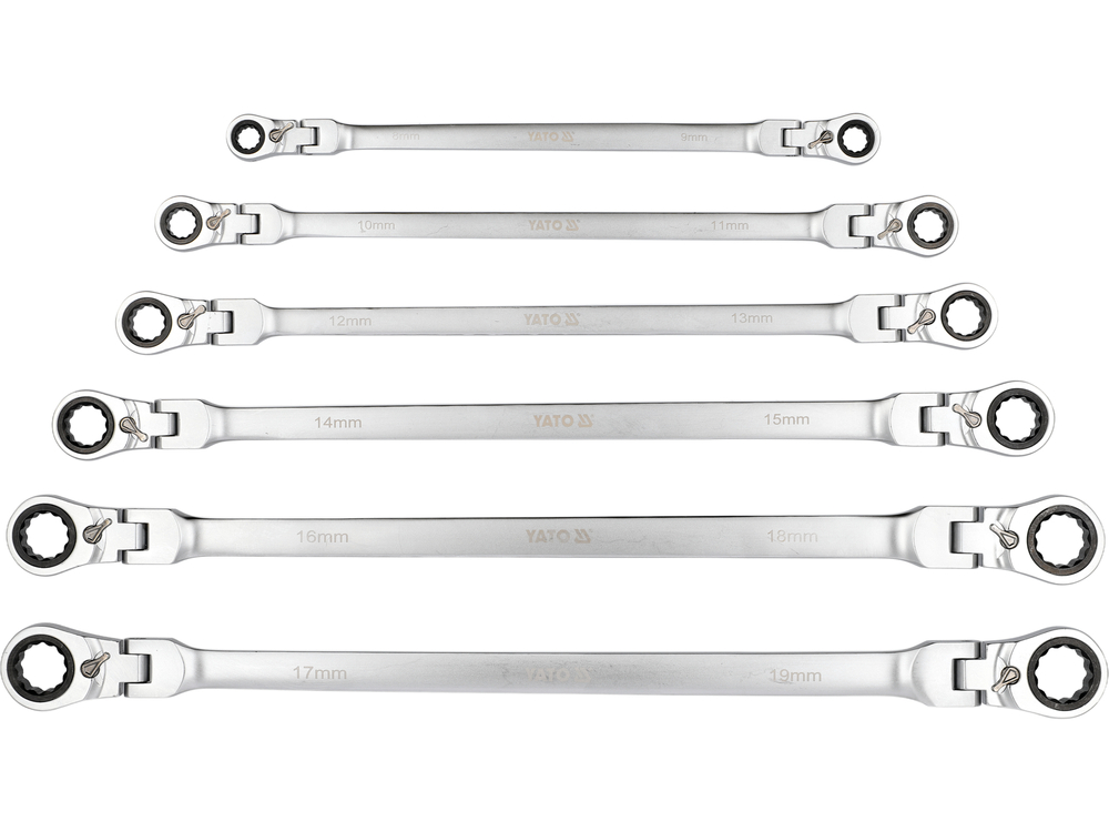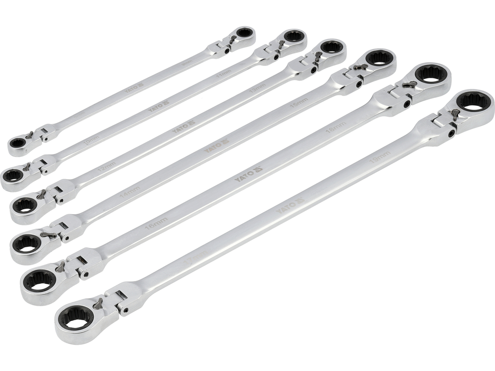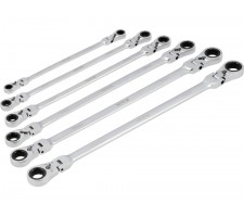 Set of long ratchet combination wrenches with a joint designed for servicing screw connections that require both high torque and access at various angles. The elongated body increases the lever arm, making it easier to loosen tightly fastened components, while the pivoting head allows the wrench to be positioned conveniently relative to the screw or nut. The 90-tooth ratchet mechanism provides a small working angle and enables smooth tightening or loosening without the need to remove the wrench from the fastener.