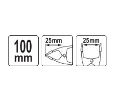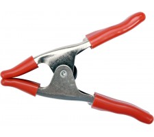 Metal spring clamp with high compression force . Made of galvanized steel sheet, working ends and handles coated with a layer of red vinyl. Total length 100 mm , opening 25 mm , depth 25 mm. For strong , fast clamping of materials during processing.