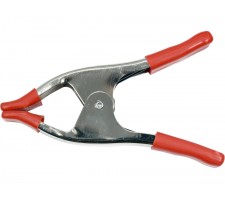 Metal spring clamp with high compression force . Made of galvanized sheet steel working ends and handles coated with a layer of red vinyl. Overall length 150 mm , opening 50 mm , depth 50 mm. For strong , fast clamping of materials during processing.