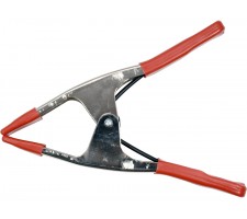 Metal spring clamp with high compression force . Made of galvanized steel sheet working tips and handles coated with a layer of red vinyl. Total length 230 mm , opening 90 mm , depth 90 mm. For strong , fast clamping of materials during processing.