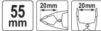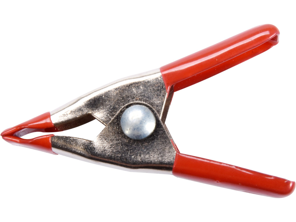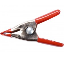 Metal spring clamp with high compression force . Made of galvanized steel sheet working tips and handles coated with a layer of red vinyl. Total length 55 mm , opening 20 mm , depth 20 mm. For fast , strong clamping of material during processing .