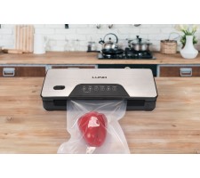Universal and reliable vacuum packing machine LUND with a power of 130 W and a maximum bag sealing width of up to 30 cm. Inside it is possible to store and cut a roll of film with a knife, so we always have it at hand and can adjust its length to the products being packed. The device allows you to select the suction function depending on the type of food. The included hose also makes it possible to extract air from special vacuum containers.