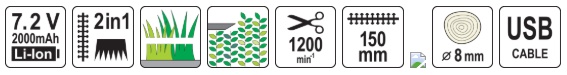 The built-in 7.2V, 2000mAh lithium-ion battery ensures convenient, cordless operation, while the 1200 rpm speed allows for fast and accurate grass trimming, especially in areas inaccessible to traditional lawnmowers. They work well near building walls, fences, around trees and shrubs, for trimming path edges, lawn edges, flower beds, and also - after changing the tip - for small branches and decorative or maintenance shaping of hedges.
